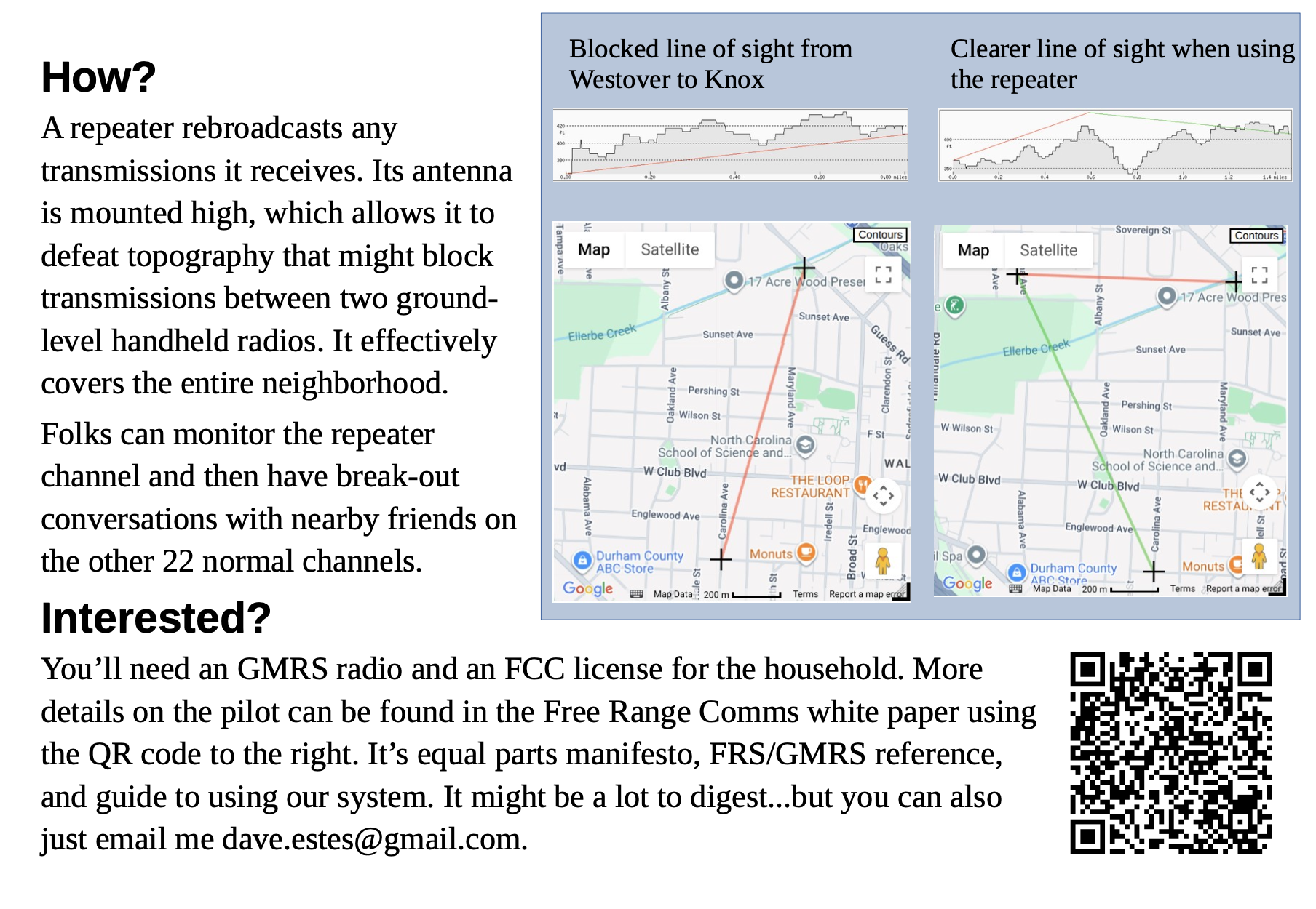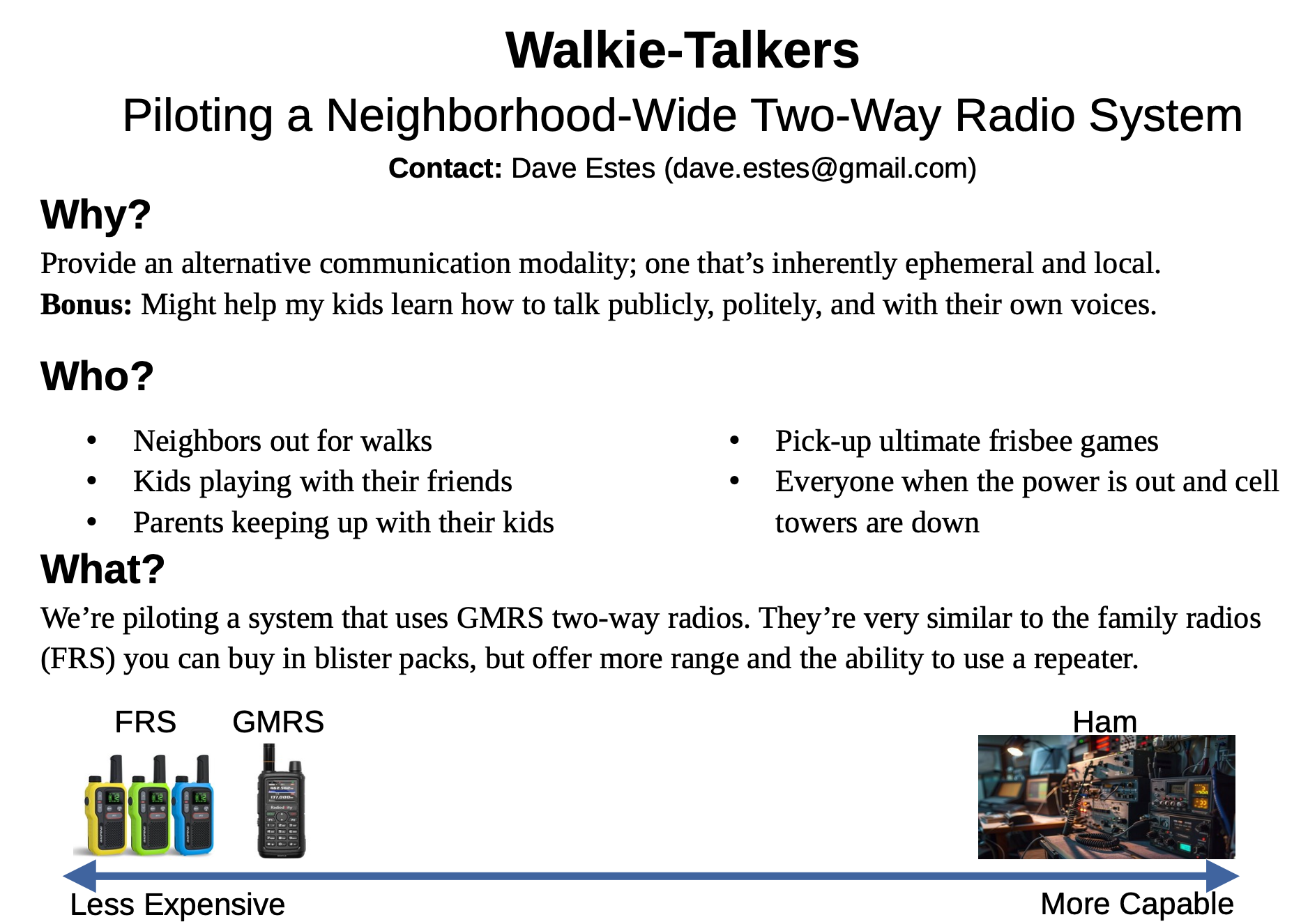 Walkie-Talkers - neighborhood wide two-way radio network. Email Dave Estes if interested - dave.estes@gmail.com